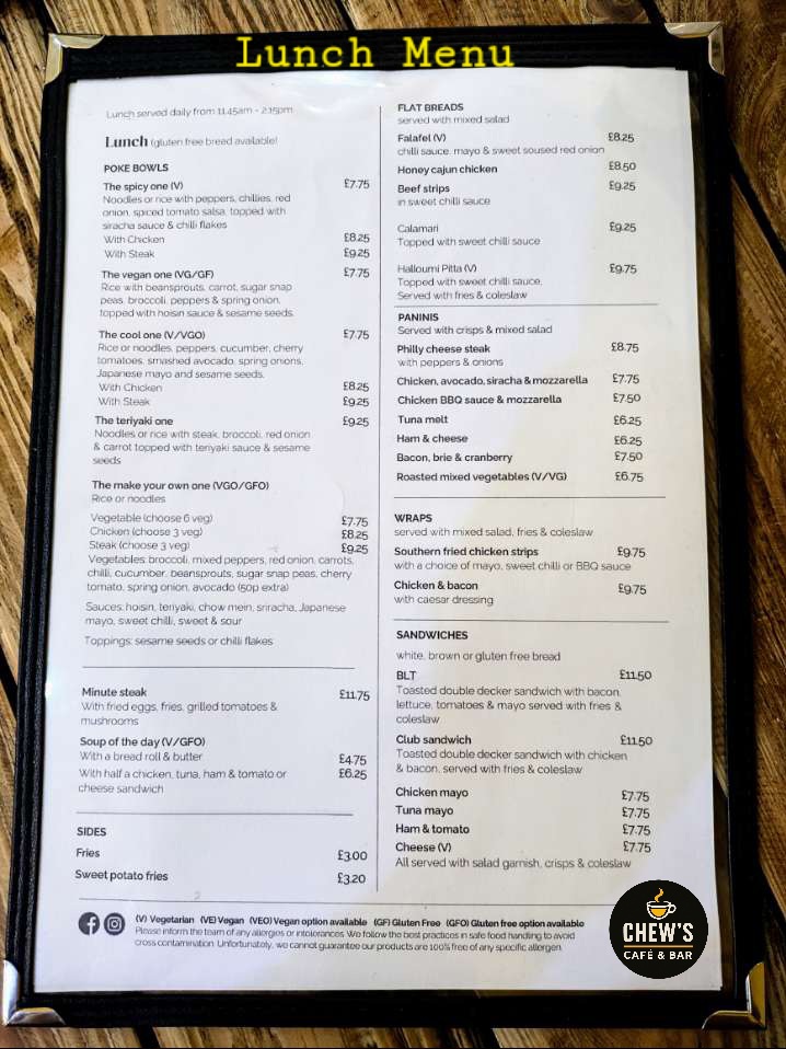 Welcome to Chew's Cafe & Bar, a vibrant dining destination located in Much Hoole, Preston. This charming cafe offers a diverse menu designed to cater to all tastes and dietary requirements. From the delightful children's menu featuring classics like poached egg on toast and pancakes to hearty wraps like Southern fried chicken strips and chicken & bacon, there is something for everyone.